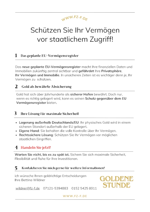 Physisches Gold, Silber, Platin, Diamanten ist seit Jahrtausenden der bewährte Schutz gegen Inflation, Währungskrisen und staatliche Eingriffe. Es ist unabhängig, wertbeständig und kann außerhalb der EU sicher gelagert werden – so behalten Sie die volle Kontrolle über Ihr Vermögen.